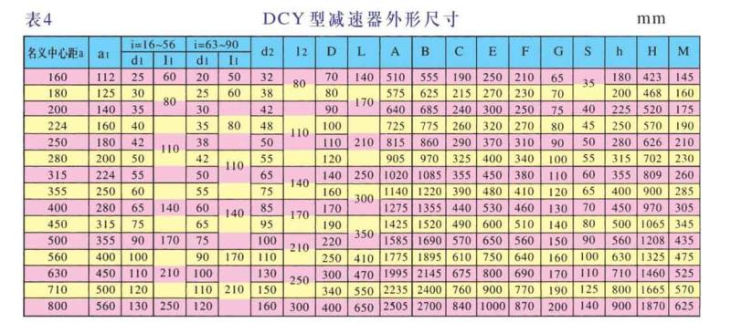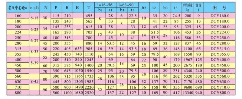 DCY、DCYK、DCZ型減速機(jī)各有15種規(guī)格,名義中心距為:160,180,200,224,250,280,315,355,400,450,500,560,630,710,800mm;每種規(guī)格均有11種傳動比(16,18,20,22.4,25,28,31.5,35.5,40,45,50)兩種旋向,四種裝配型式,分別組成660種減速機(jī)。